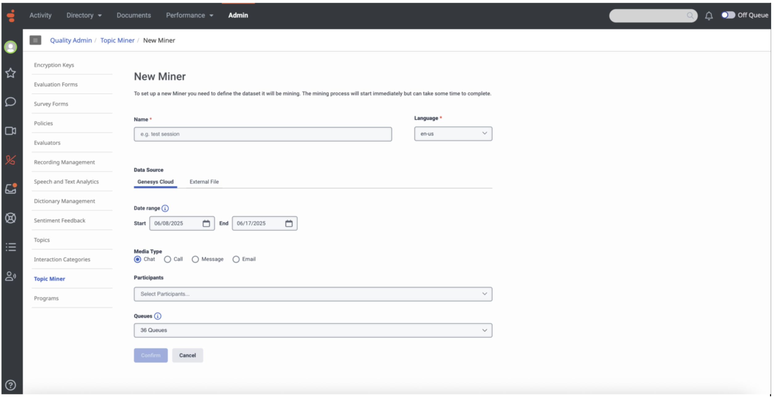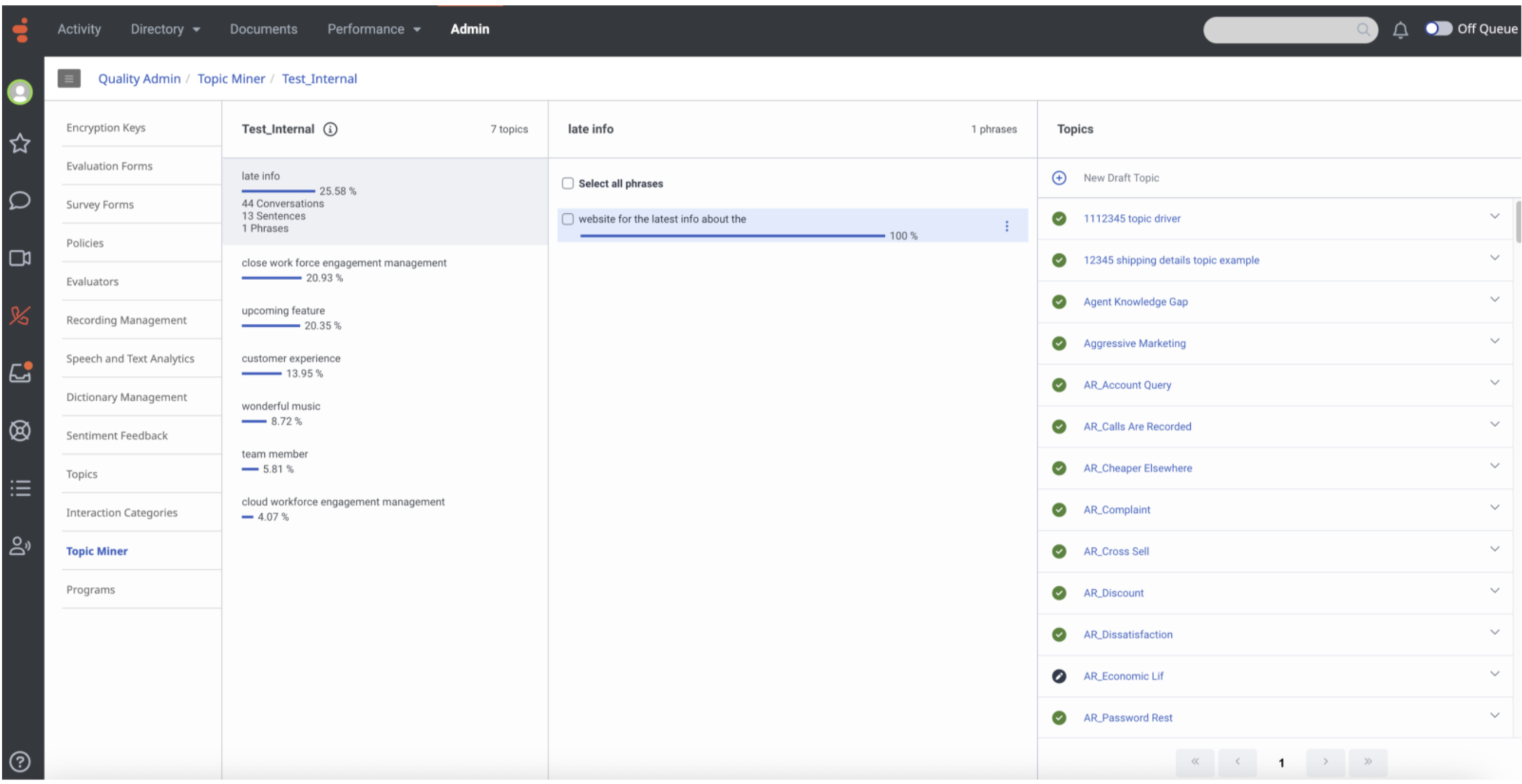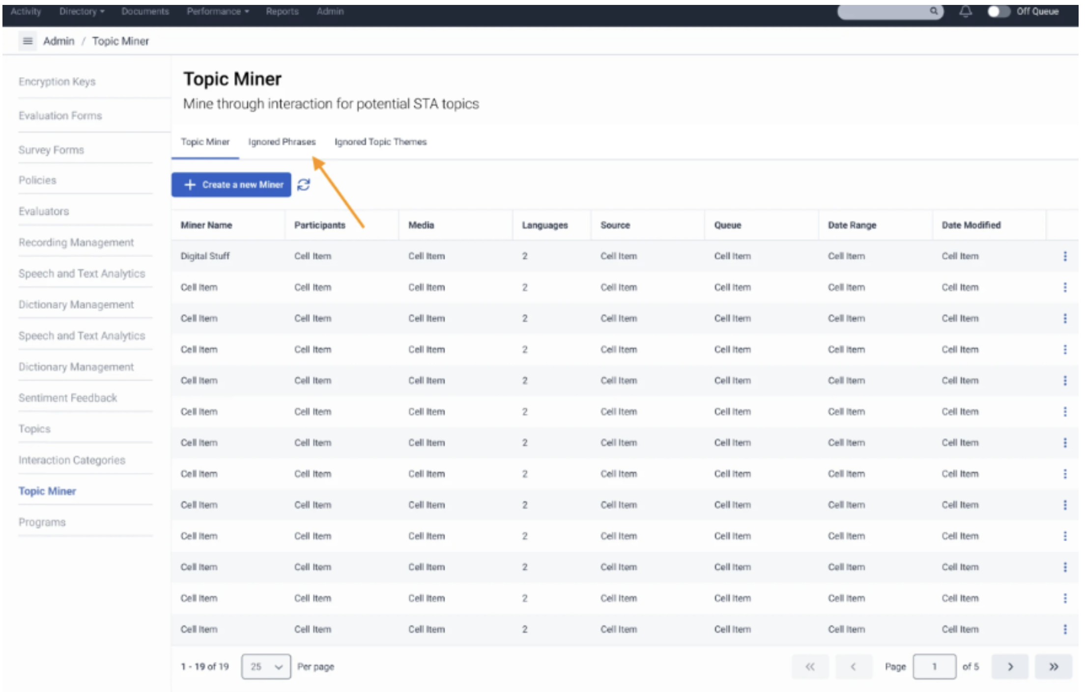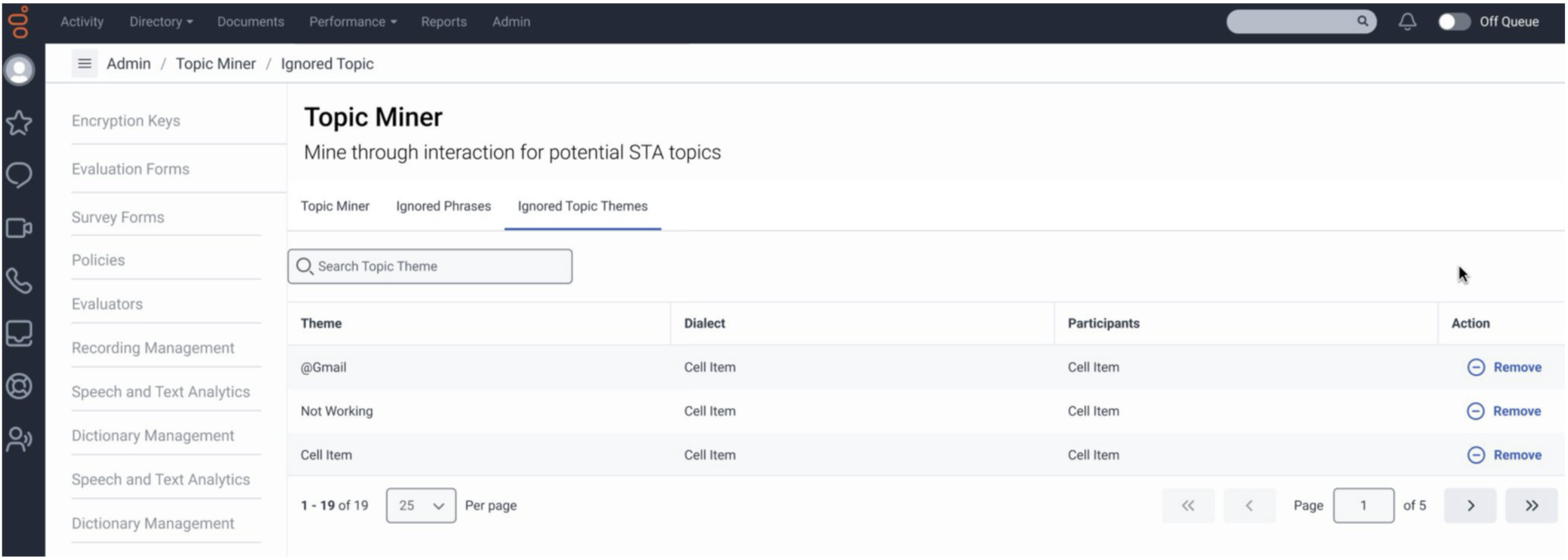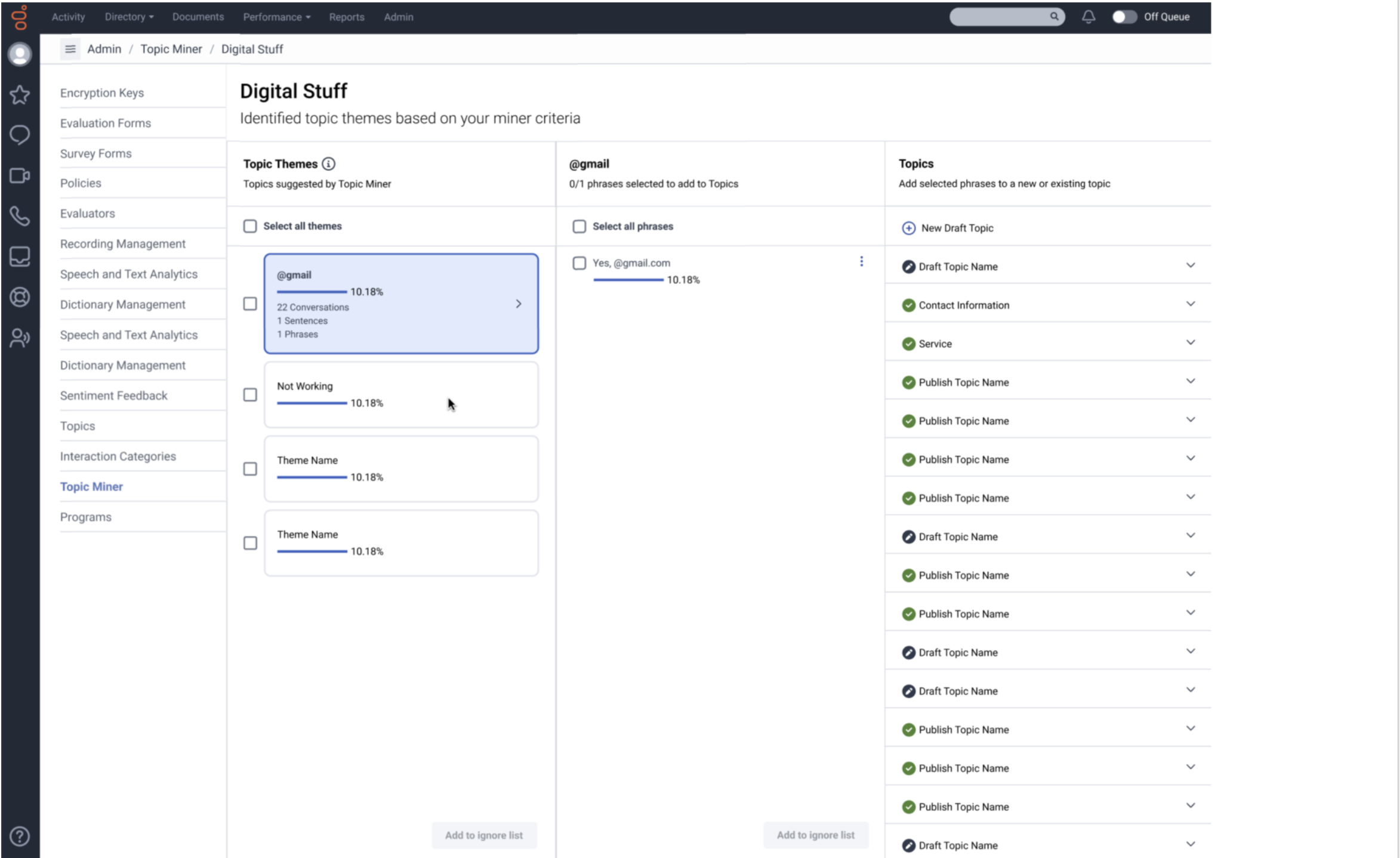 In einer zukünftigen Version wird Genesys Cloud neue Funktionen im Topic Miner einführen, die es Benutzern ermöglichen, unerwünschte Themen und Ausdrücke zu ignorieren, wodurch die Mining-Ergebnisse relevanter und einfacher zu verwalten werden. Diese Änderungen tragen dazu bei, Wiederholungen zu reduzieren und Mining-Workflows zu optimieren.