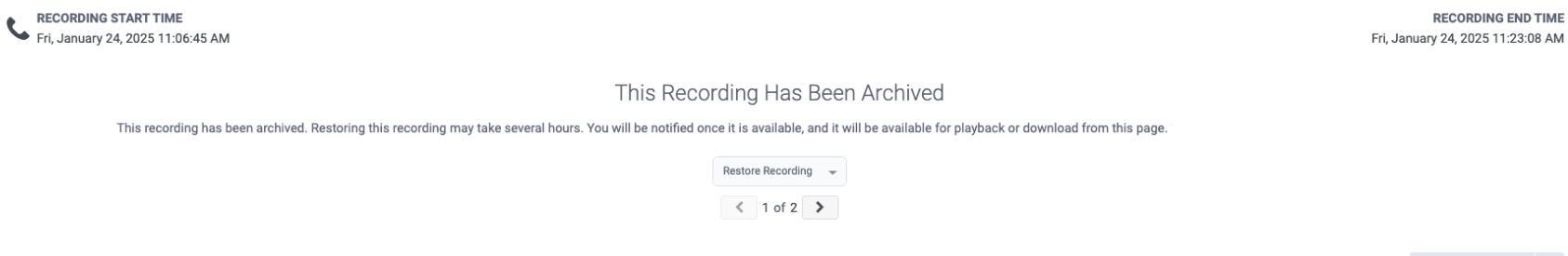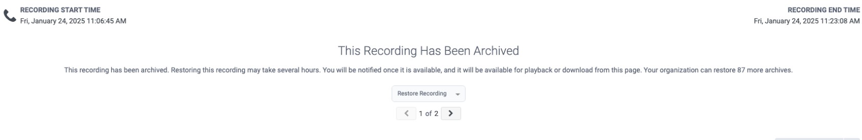 - Wiederhergestellte archivierte Aufzeichnungen werden auf die gesamte Speichernutzung Ihres Unternehmens angerechnet. Genesys Cloud empfiehlt Administratoren, Wiederherstellungen unter Berücksichtigung dieser Überlegung zu verwalten, um eine optimale Speichernutzung zu gewährleisten.