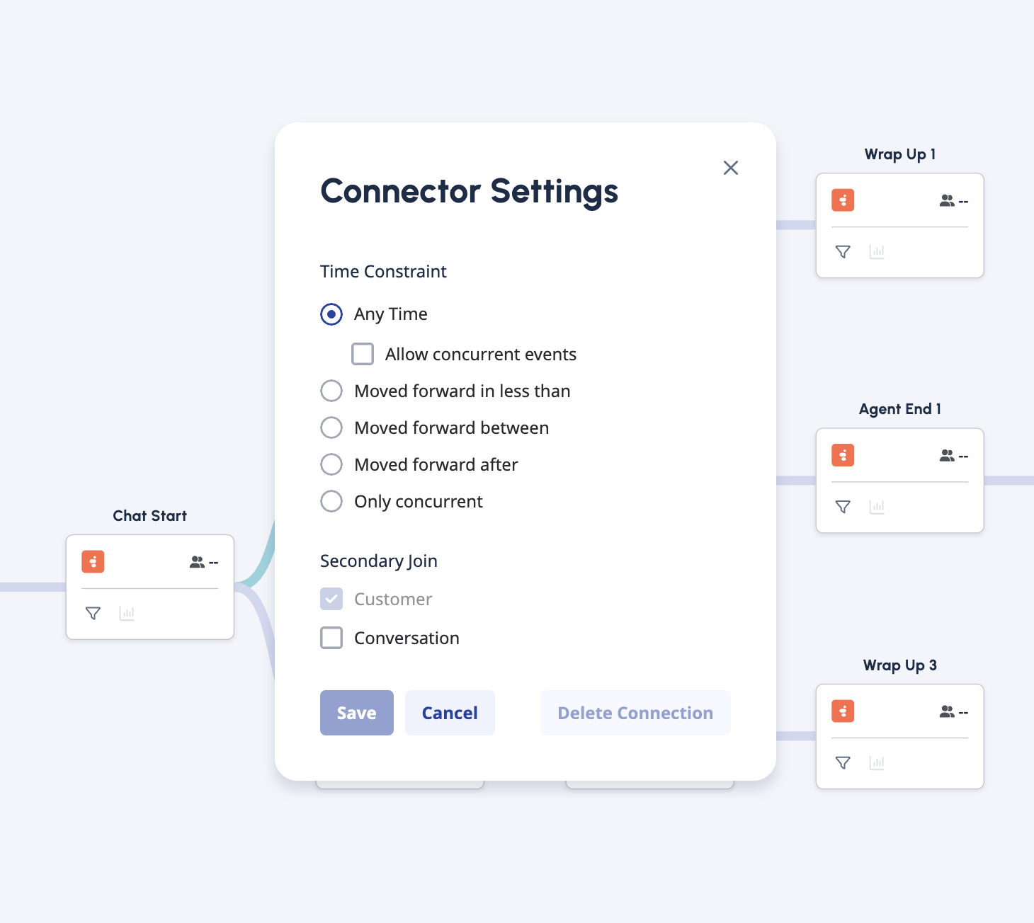 - Sie können eine sekundärer Join für die Verbindung. Standardmäßig nimmt Genesys Cloud an jedem Ereignis basierend auf dem Kunden teil. Sie können auch einen sekundären Beitritt zur Konversation festlegen. Weitere Informationen zu einem Beispielanwendungsfall finden Sie unter Anwendungsfall für eine einfache Reise .