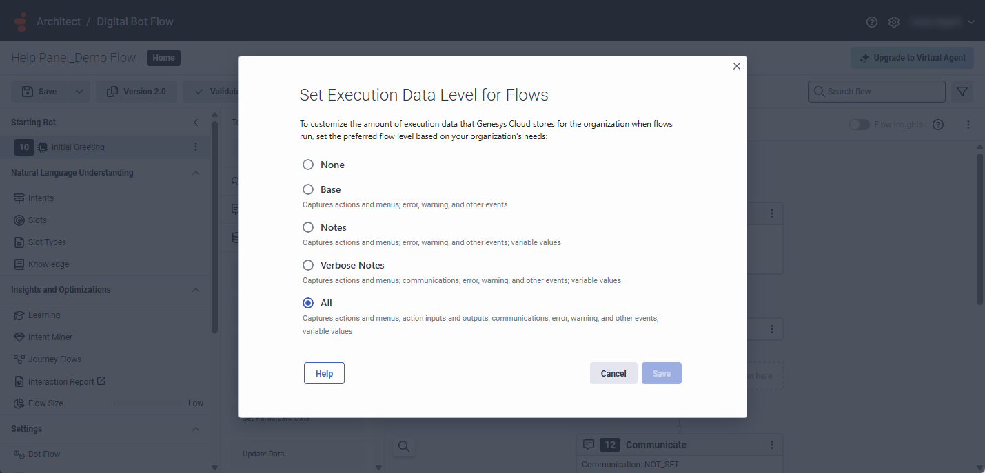 - Öffnen Sie das Dialogfeld „Ausführungsdatenebene für Flows festlegen“ und passen Sie Ihre flowbasierten Ausführungsdateneinstellungen an.