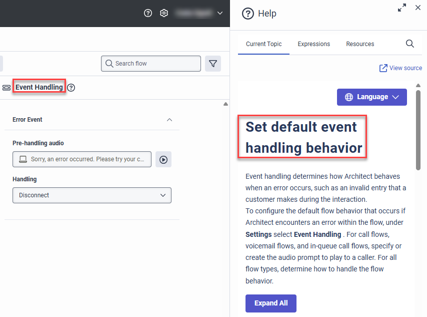- Suchen – Das Hilfefenster enthält eine Suchleiste Hier können Sie direkt nach Inhalten des Resource Centers suchen, ohne zum Genesys Cloud Resource Center navigieren zu müssen: