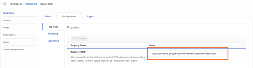 - Geben Sie im Abschnitt „Eigenschaftsname“ die Werte in der Ermittlungs-URI Und Maximale Lebensdauer des Aktualisierungstokens Felder. Der folgende Screenshot zeigt eine OpenID Connect Messenger-Integrationskonfiguration. Klicken Sie auf das Bild, um es zu vergrößern.