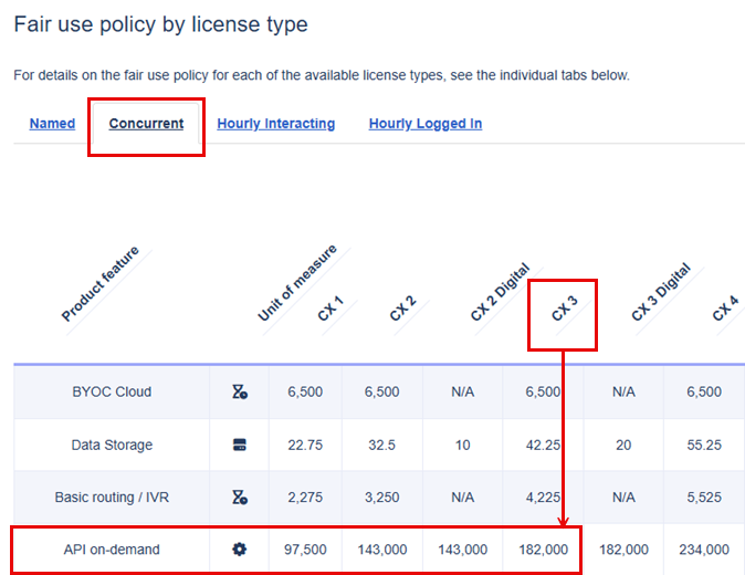 In diesem Beispiel verfügt der Kunde über eine Genesys Cloud CX 3 Concurrent-Lizenz. Gemäß der Tabelle zur fairen Nutzung von API-Anfragen beträgt deren Kontingent 182.000 Anfragen pro Monat.