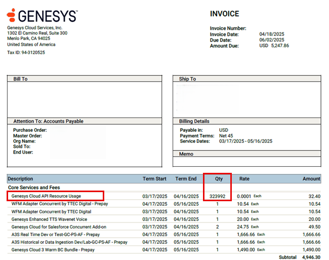 In diesem Beispiel erscheinen die Verbrauchsposten vom 17. März bis zum 16. April auf der Rechnung vom 18. April. Diese Gebühr beinhaltet die Nutzung von API-Ressourcen und andere Posten, die Genesys nutzungsabhängig bzw. monatlich abrechnet und nicht im Voraus bezahlt.