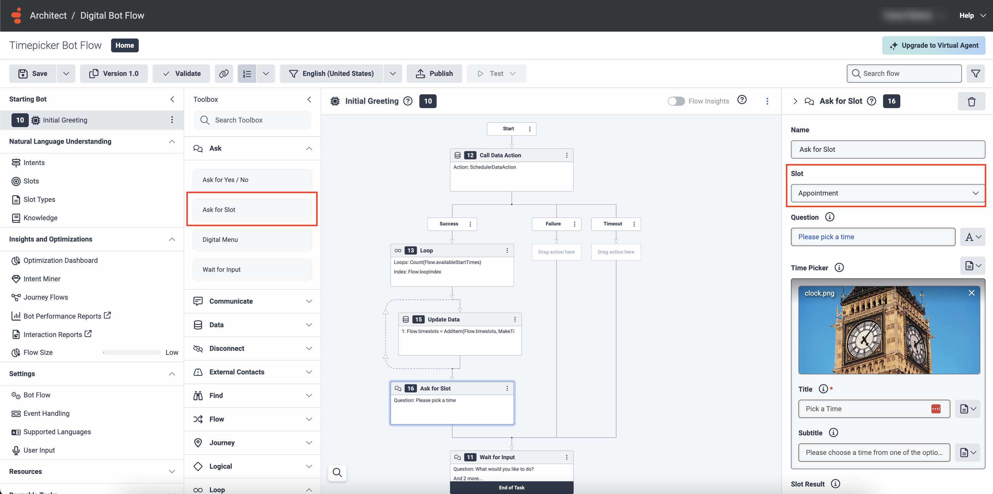 - Ziehen Sie aus der Architect-Toolbox ein Fragen Sie nach Slot Aktion in den Aufgabeneditor, unterhalb der Schleife Aktion.