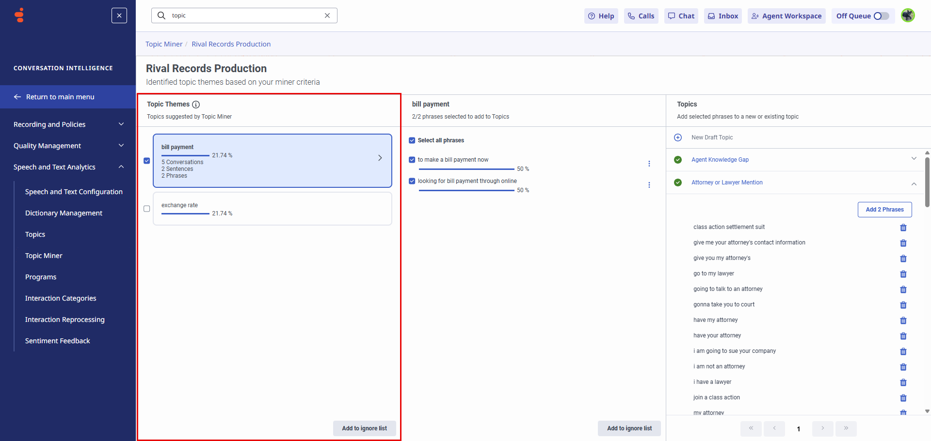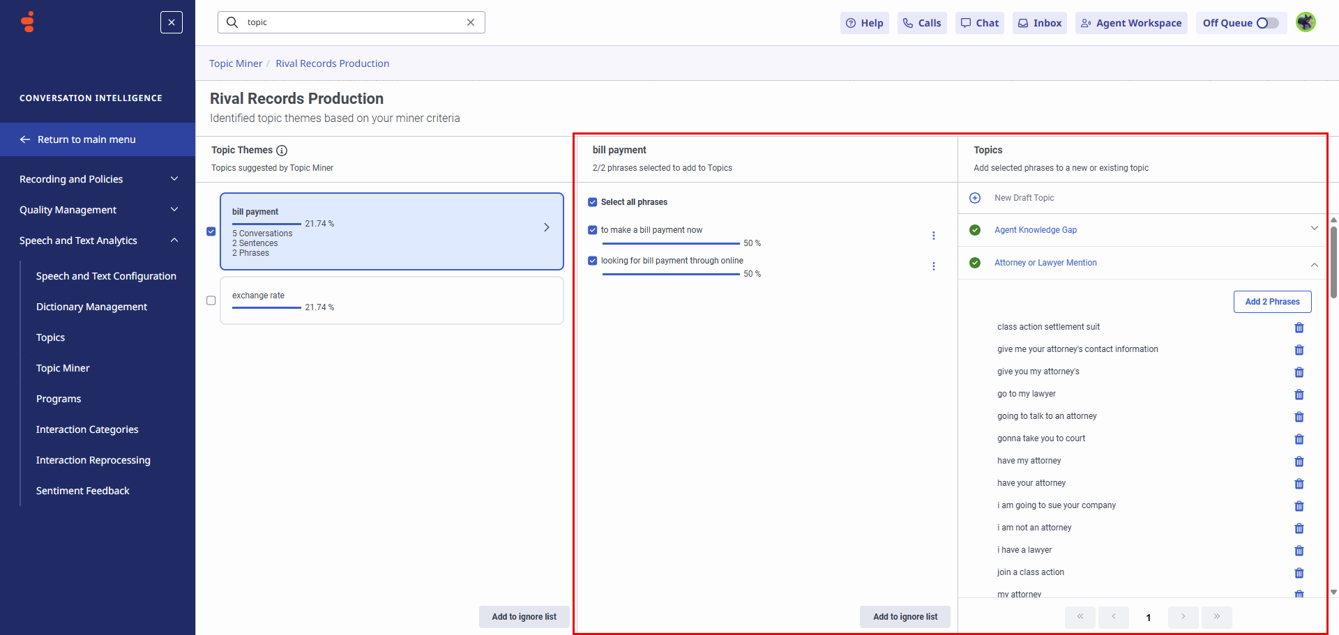- Klicken Speisekarte > Konversationsintelligenz > Sprach- und Textanalyse > Themen-Miner .