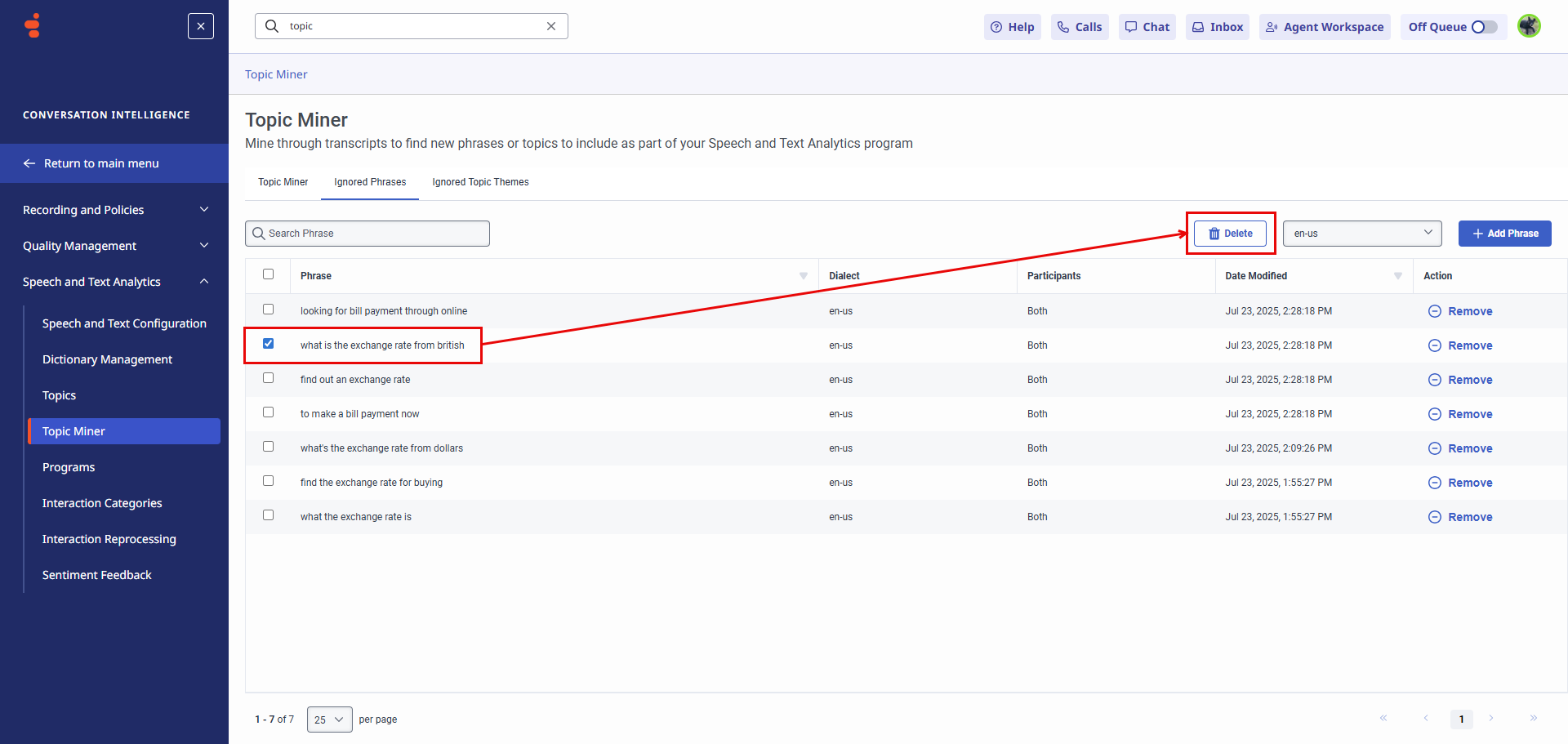 Genesys Cloud fügt automatisch alle zugehörigen Phrasen zur Phrasen-Ignorierliste hinzu. Sie können ignorierte Themen für den Agenten, den Kunden oder beide Seiten des Gesprächs verwalten.