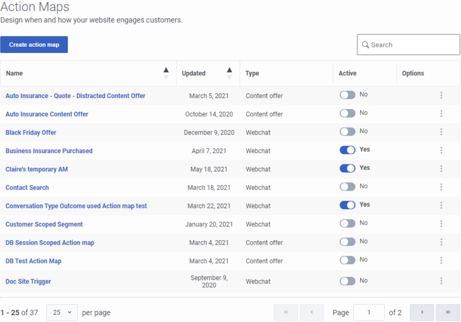Um zu erfahren, wie die Besucher mit einer bestimmten Aktionskarte interagiert haben und ob das Ergebnis der Aktionskarte erreicht wurde, sehen Sie sich den Bericht Aktionskarten an. Weitere Informationen zur Action Maps-Ansicht finden Sie unter Journey Action Maps-Ansicht im Genesys Cloud CX Resource Center.