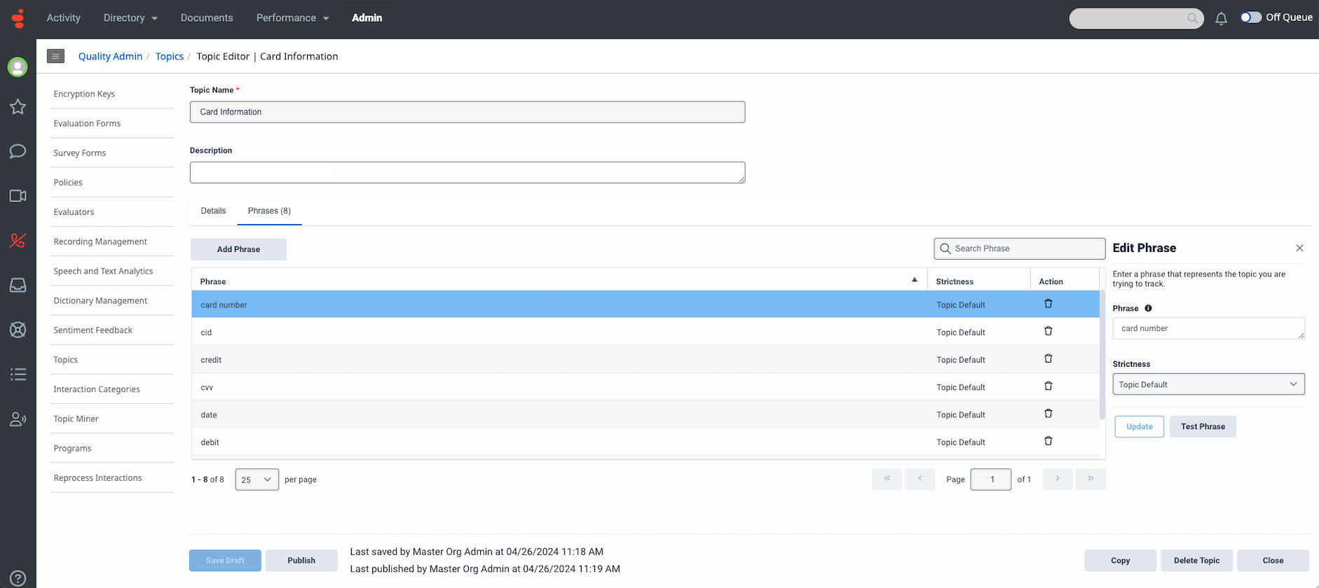 - Von der Strenge Wählen Sie in der Liste eine andere Strenge aus oder behalten Sie die aktuelle Strenge bei.Notiz : Striktheit definiert, wie vertrauensvoll das System sein muss, um einen Themenausdruck zu erkennen. Wenn Sie z. B. Niedrig (65) für eine Phrase oder ein Thema wählen, muss die Themenphrase mit einem Konfidenzniveau von mindestens 65 identifiziert werden, um identifiziert zu werden. Wenn das System eine Phrase mit einer Konfidenz von 55 erkennt und das Thema mit einer Strenge von „Niedrig“ (65) konfiguriert wurde, wird die Phrase als „nicht gefunden“ markiert und daher für diese Interaktion nicht mit dem Thema verknüpft. Wenn die vom System zurückgegebene Strenge jedoch höher als 65 ist, wird die Phrase als gefunden markiert und für diese Interaktion mit diesem Thema verknüpft..