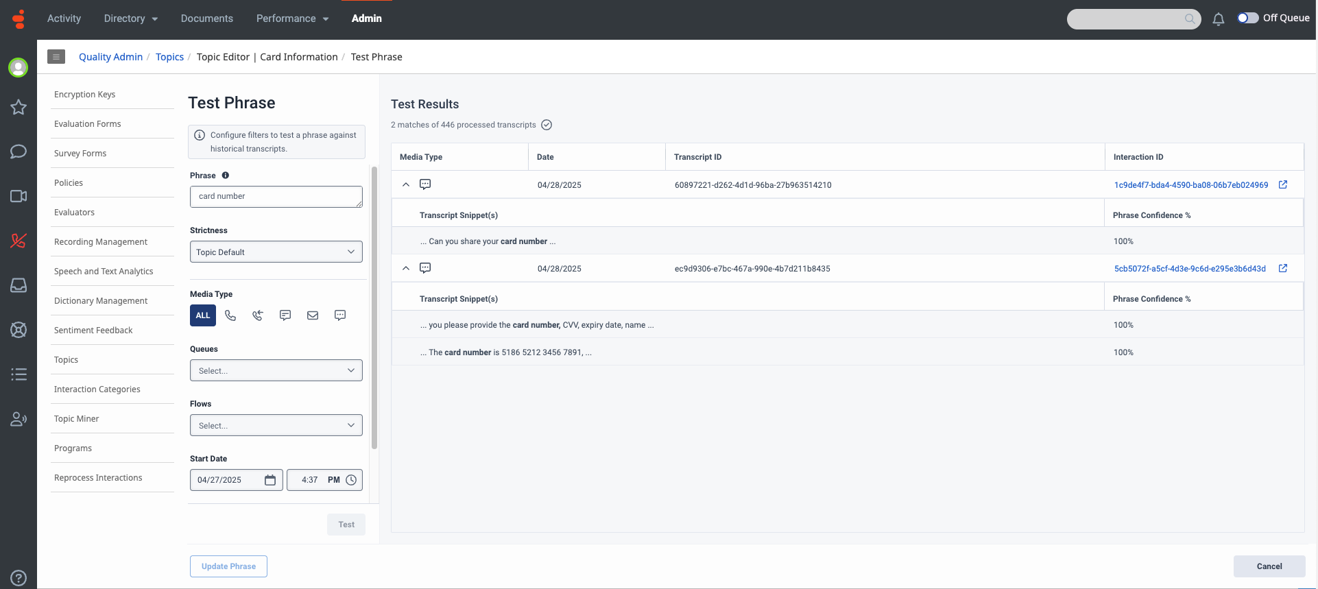 - Um den Test auszuführen, klicken Sie auf Prüfen . Mithilfe dieser Phrase wird eine Suche in historischen Gesprächen ausgeführt. Die Ergebnisse werden im Filterbereich auf der rechten Seite des Bildschirms angezeigt.
