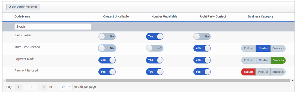 Angenommen, eine Vorschaukampagne bietet Agenten vier Abschlusscodes: Falsche Nummer, mehr Zeit erforderlich, Zahlung erfolgt und Zahlung abgelehnt. Bei ausgehenden Anrufen lauten die Zuordnungen unter den Abschlusscodezuordnungen wie folgt: